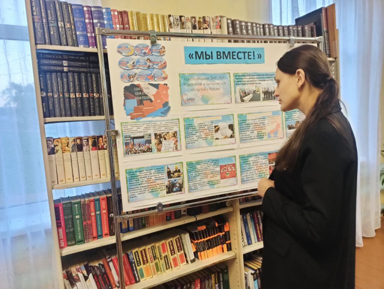 В нашей сельской библиотеке оформлен особенный информационный стенд – «Мы вместе». Он посвящен важному событию – Дню воссоединения Донецкой Народной