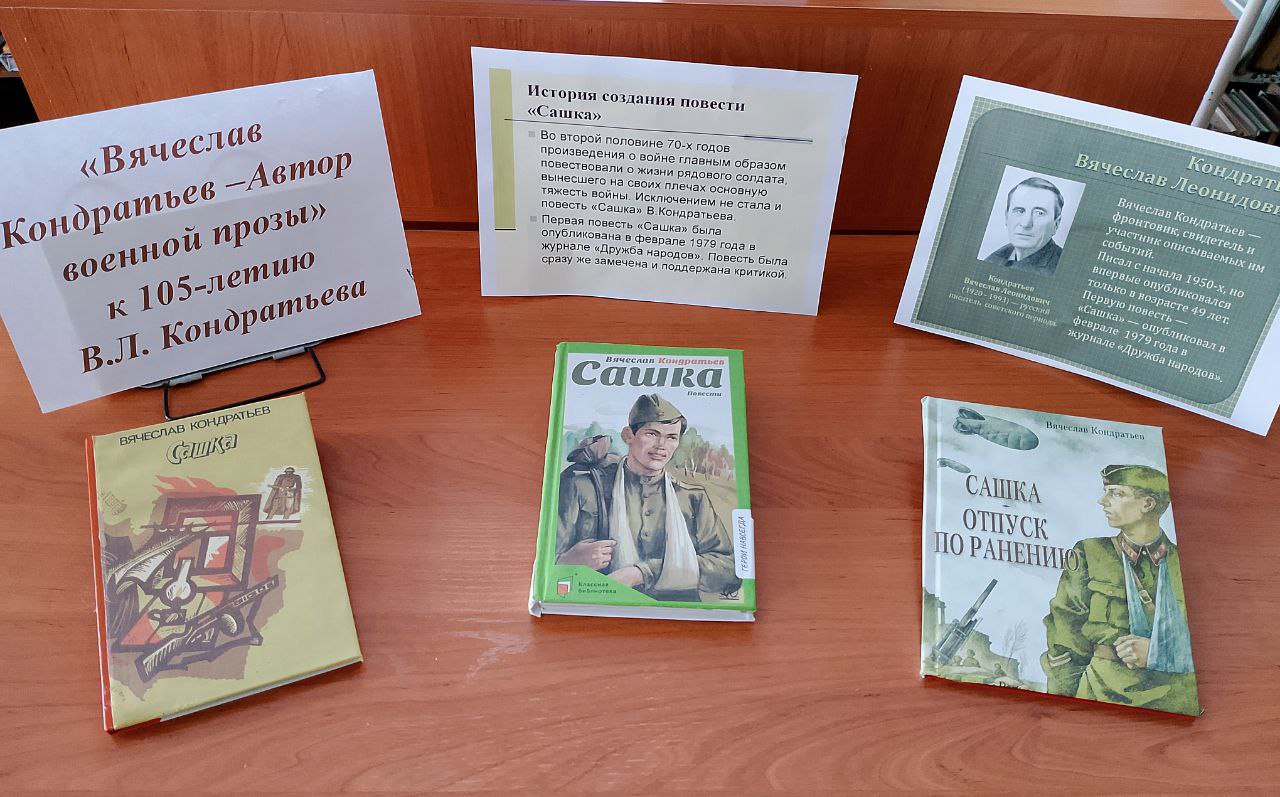 С радостью сообщаем вам, что в нашей библиотеке оформлена особенная выставка книги «Сашка», посвященная 105-летию со дня рождения замечательного писателя – Вячеслава Кондратьева.
