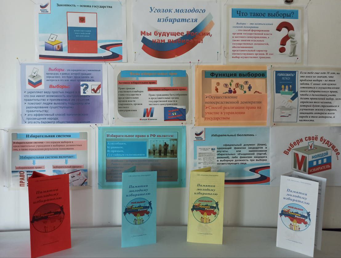 В рамках дня Молодого избирателя в библиотеке с .Новогорлеевка, организован ,,Уголок молодого избирателя,,. Приглашаем молодых и будущих избирателей ,для ознакомления с основными понятиями и законами Российской Федерации .