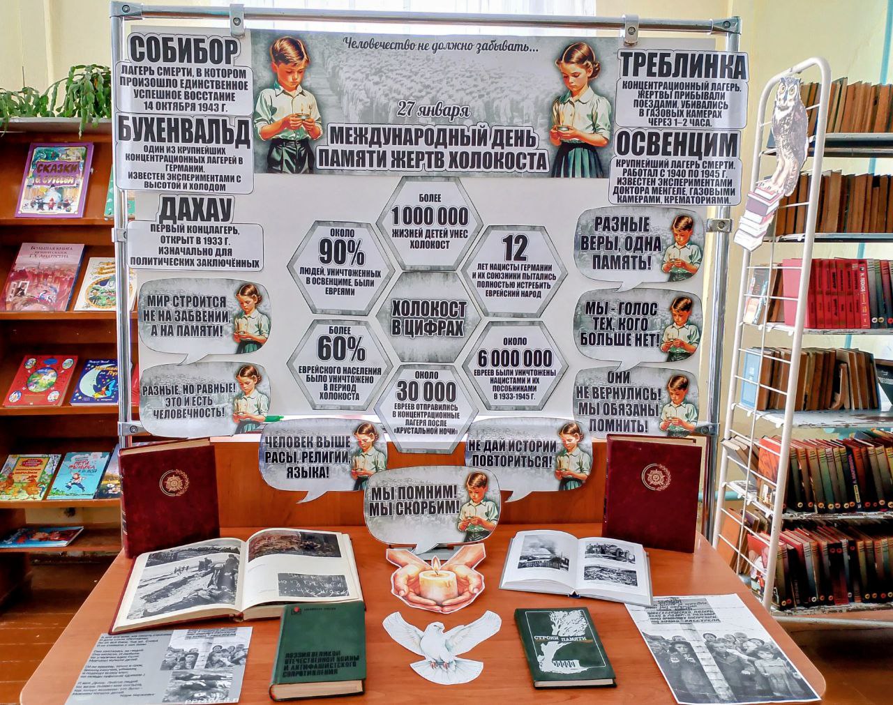 Сегодня, в Международный день памяти жертв Холокоста, в нашей библиотеке оформлена выставка-обзор: «В истории навечно». Это не просто экспозиция, а дань уважения миллионам невинных жизней, оборванных в результате одного из самых страшных преступлений против человечества.
